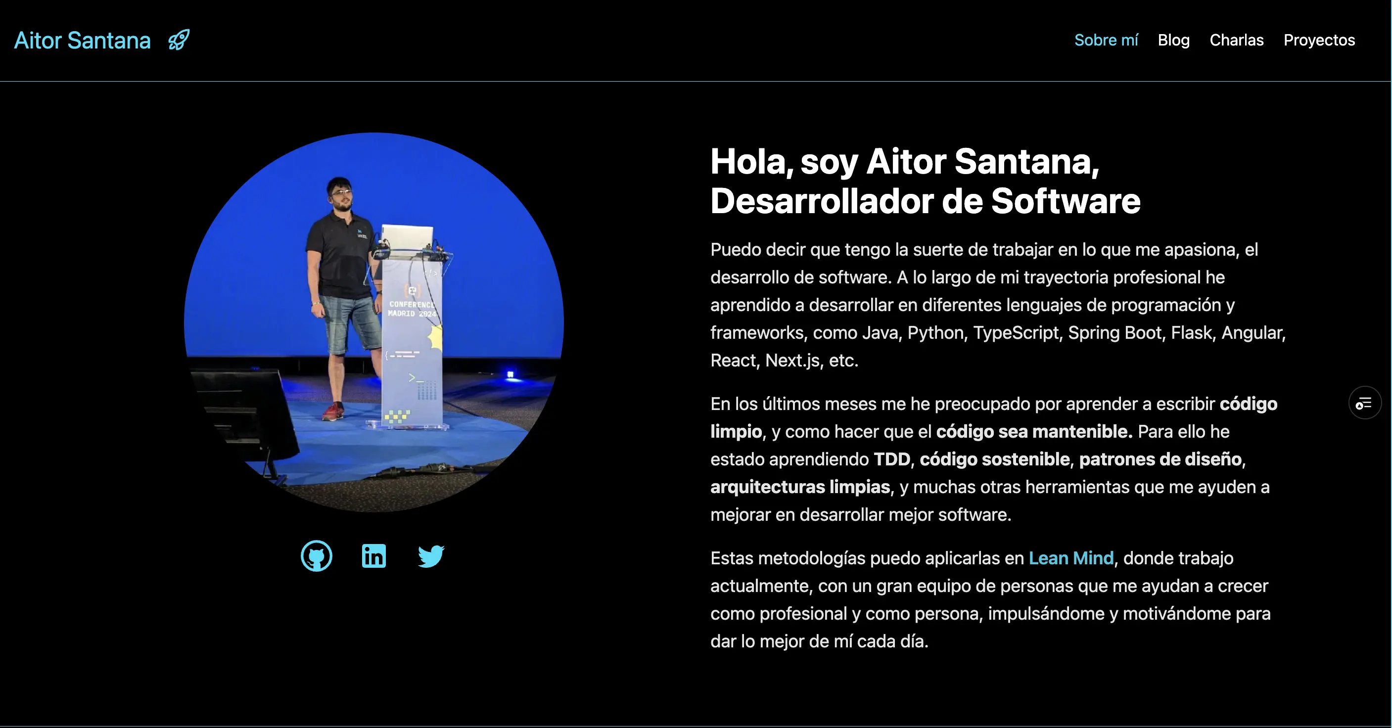 Presentación personal con mis últimos proyectos y charlas destacadas.